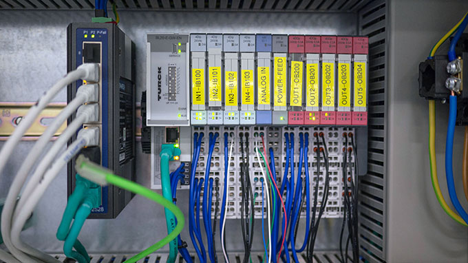 The HMI communicates via Profinet with the gateways of the Turck BL20 I/O system, which are located in a switch box on each of the four CNC machines. The sensors and actuators that measure and regulate the condition of the KSS coolant in the CNC machines are connected to the local BL20 gateways. The BL20 I/O modules help to reduce the wiring effort for the system integrator with the installation.