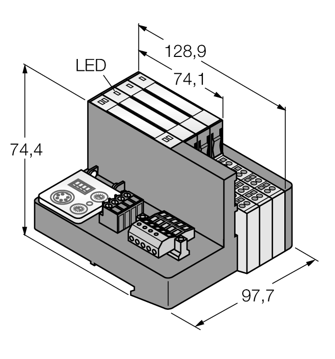- LEDs for display of supply voltage, group and bus errors as well as status and diagnostics