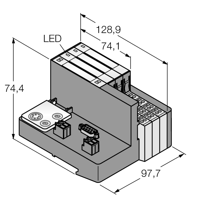 - LEDs for display of supply voltage, group and bus errors as well as status and diagnostics