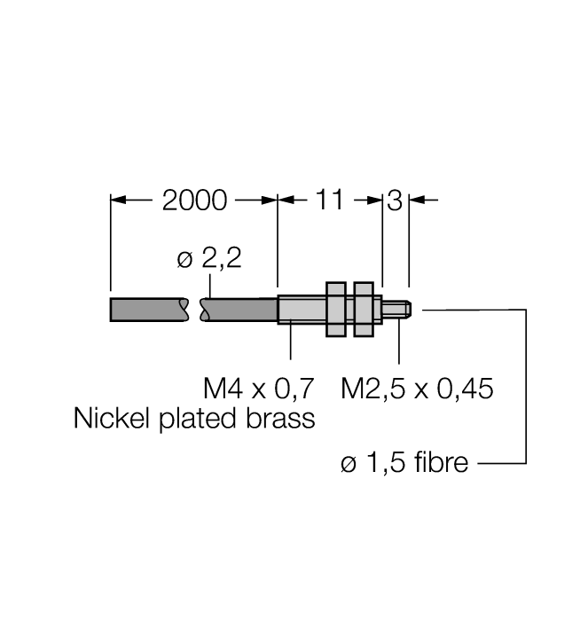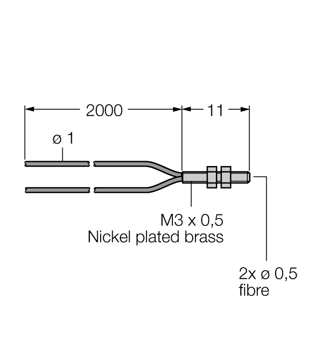Plastic fiber, sensing mode: Opposed mode, threaded bush M3 x 0.5 mm, preassembled wire without end tip, polyethylene jacket, ambient temperatures -30 °C…+70 °C |