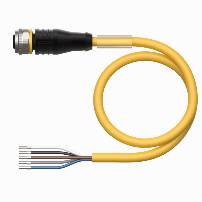 Power supply cable, 7/8” connector, straight, 4-pin to 7/8” female connector, straight, 4-pin, cable length: 2 m, jacket material: PVC, yellow; other cable lengths and qualities available, see www.turck.com |