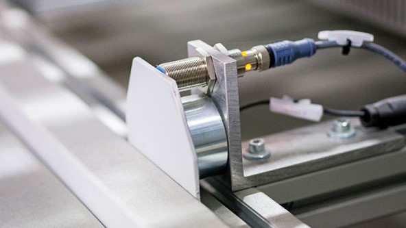 To anchor the carts on the stacker, electromagnets are fitted which can be locked or released via the pushbutton actuator. An inductive sensor detects whether a cart is positioned correctly. If an emptied cart is positioned in front of the sensor, the light button flashes and the cart can be locked again for renewed filling. Two carts are positioned opposite the stacker to form a module, and the print shop in Belgium has a total of five modules.